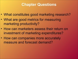 Chapter Questions • Whatconstitutes good marketing research? • What are good metrics for measuring marketing productivity? • How can marketers assess their return on investment of marketing expenditures? • How can companies more accurately measure and forecast demand?