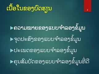 ເນໍ້ອໃນຂອງບົດຮຽນ ຄວຳມໝຳຍຂອງແບບຈຳລອງຂໍ້ມູນ ຈຸດປະສົງຂອງແບບຈຳລອງຂໍ້ມູນ ປະເພດຂອງແບບຈຳລອງຂໍ້ມູນ ຄຸນສົມບັດຂອງແບບຈຳລອງຂໍ້ມູນທີີ່ ດີ 2