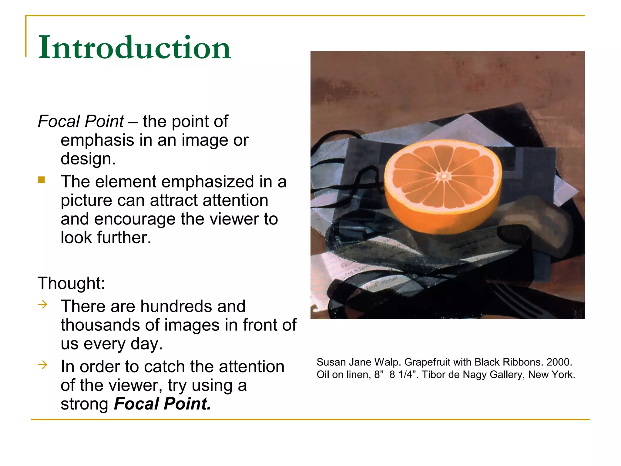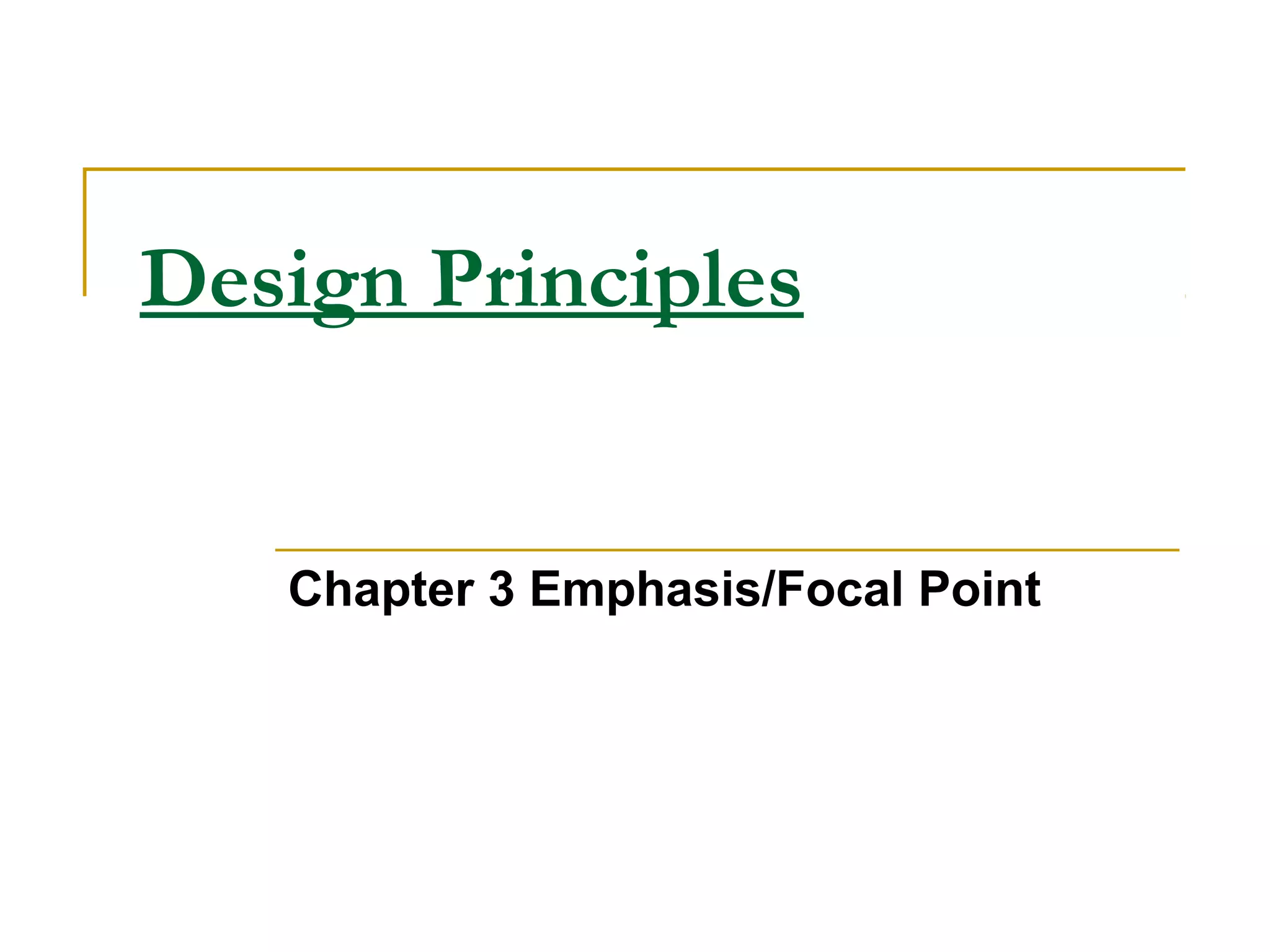 The document discusses design principles related to establishing an emphasis or focal point. It defines a focal point as the element in an image or design that attracts attention and encourages viewing. There are several ways to achieve emphasis through a focal point, including contrast, isolation, and placement of the focal point. Too many focal points can lead to visual confusion. Proper use of a strong, well-placed focal point is important for catching a viewer's attention in the many images they see each day.