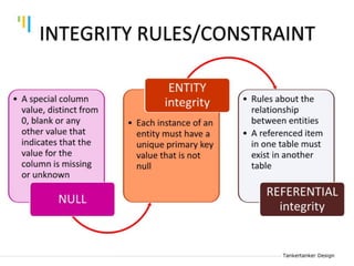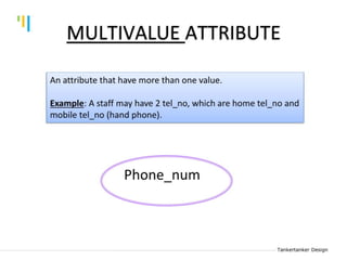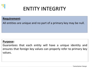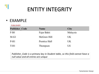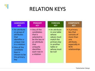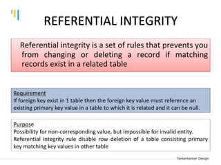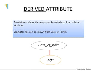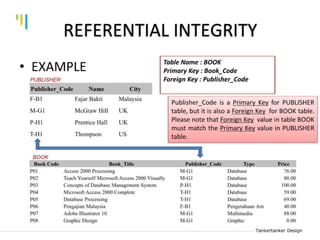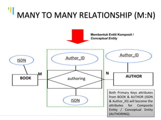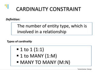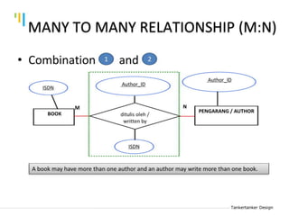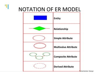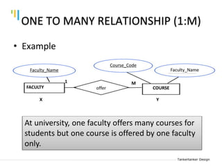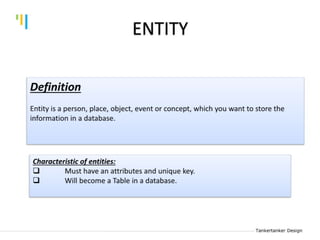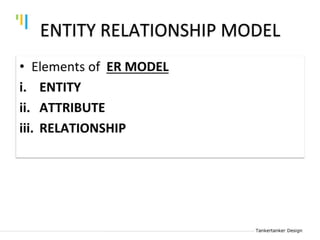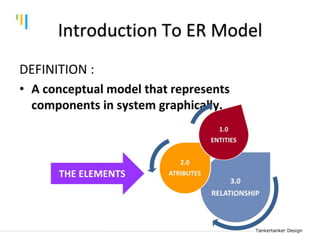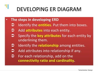 This document discusses database design using Entity Relationship Diagrams (ERDs). It covers how to draw ERDs using Chen's Model and Crow's Foot notations and define the basic elements of ERDs. Conversion rules are presented to convert ERDs into relational tables for one-to-one, one-to-many, and many-to-many relationships. An example is given to demonstrate drawing an ERD for a company database and converting it into relational tables.