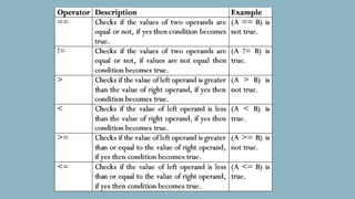 The document discusses different types of operators in Java including arithmetic, relational, bitwise, logical, assignment, and miscellaneous operators. It provides examples of using arithmetic operators like addition and subtraction on integer variables and using relational operators to compare values. Logical operators are described as evaluating Boolean expressions. Assignment operators are listed as supporting operations like assignment equal. The miscellaneous ternary operator is explained as evaluating a condition and assigning a value based on the result. Finally, operator precedence is covered as affecting how expressions are evaluated based on which operators have higher precedence over others.