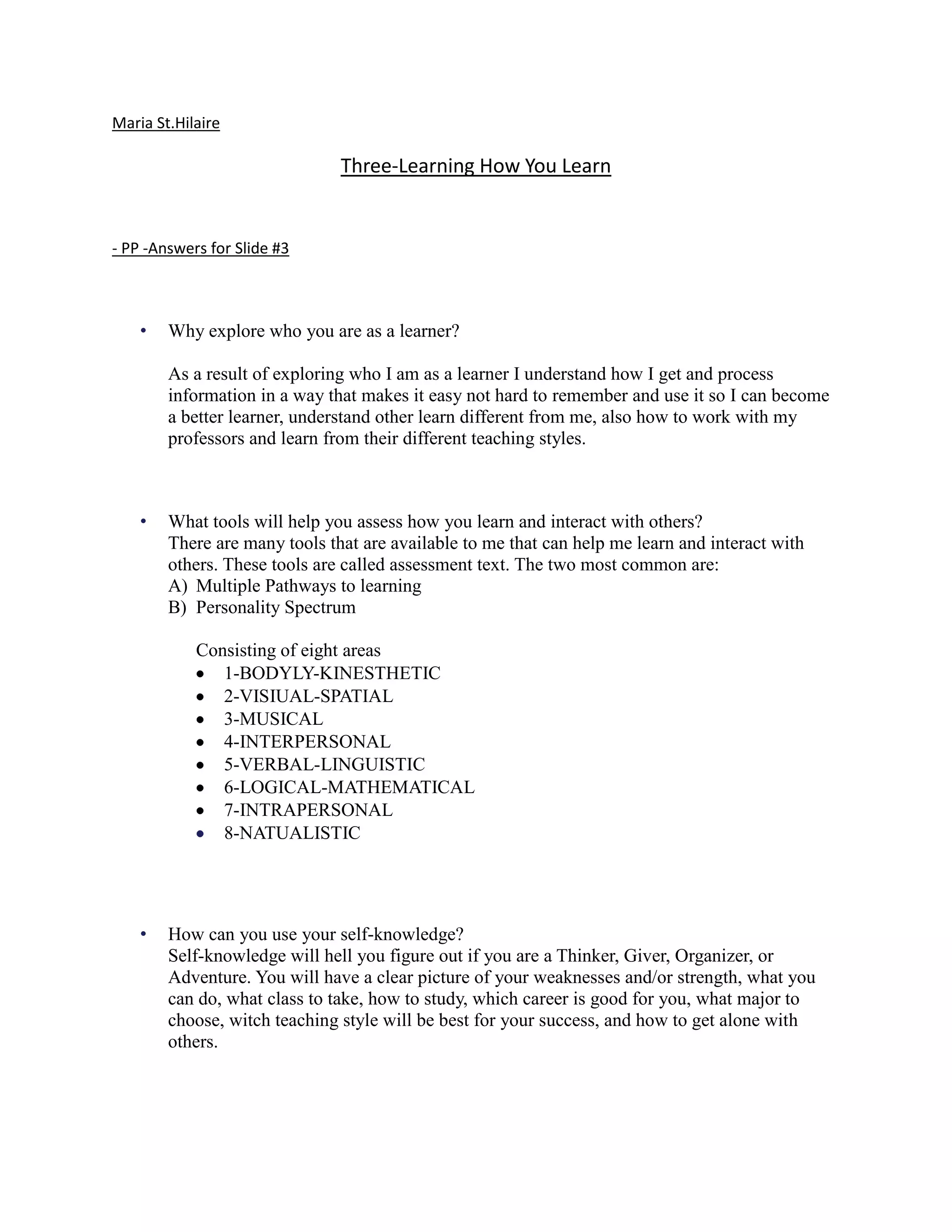The document discusses exploring one's learning style through assessment tools to gain self-knowledge about strengths and weaknesses to better understand how to process information, choose classes and careers, and identify and manage any potential learning disabilities. Key tools mentioned are the Multiple Pathways to Learning and Personality Spectrum assessments, which evaluate areas like bodily-kinesthetic, visual-spatial, musical, and interpersonal skills. Self-knowledge of one's learning style can help determine what type of learner and career fits best and which teaching methods are most effective.