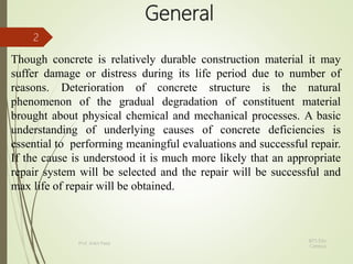 The document discusses various types of polymer concrete, including polymer impregnated concrete (PIC), polymer Portland cement concrete (PPCC), and polymer concrete (PC). PIC involves impregnating hardened Portland cement concrete with a monomer, then polymerizing it in place. PPCC is produced by incorporating a polymer or monomer emulsion into ordinary concrete. PC uses a polymer as the sole binder instead of Portland cement. Polymer concrete has improved strength, adhesion, chemical resistance, impact resistance, and impermeability compared to ordinary concrete.
