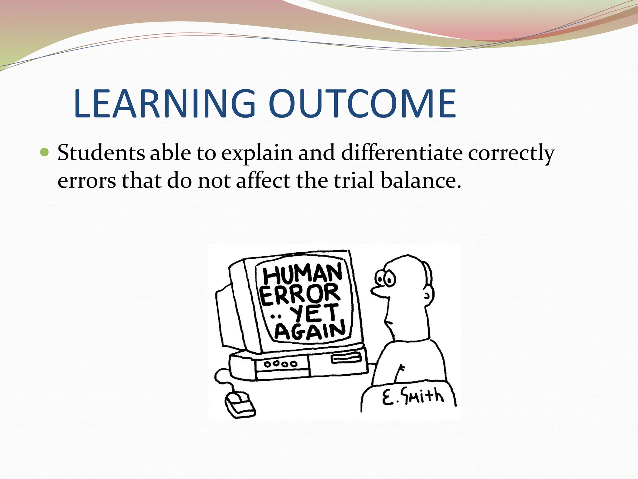 The document outlines different categories of accounting errors that do not affect the trial balance, categorized as principle errors, original entry errors, omissions, reversal of entries, commission errors, and compensating errors. Each type is illustrated with examples and correct entries versus incorrect entries. Additionally, it provides a reflection section with multiple transactions for students to identify the type of error present if the trial balance is balanced.