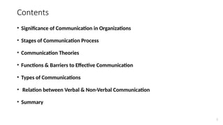 The document discusses the importance of communication in organizations, outlining its stages, theories, functions, and barriers. It highlights various types of communication, including verbal, non-verbal, written, and visual, and emphasizes the role of effective communication in achieving organizational goals. Additionally, it addresses the challenges posed by noise, cultural differences, and technological barriers, while suggesting methods for improving communication skills.