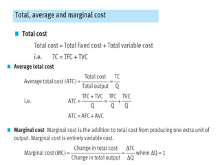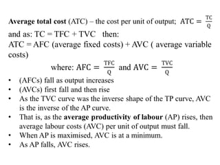 This document discusses production and costs in both the short-run and long-run. In the short-run, at least one factor of production is fixed, while in the long-run all factors are variable. The factors of production are land, labor, capital, and entrepreneurship. Laws of returns to scale describe how output responds to changing variable inputs. Short-run costs include total, fixed, and variable costs. Long-run average costs depend on whether there are increasing, constant, or decreasing returns to scale. Economies of scale from specialization, bulk purchasing, and other factors can lower long-run average costs.