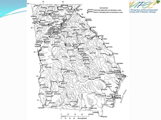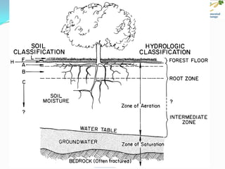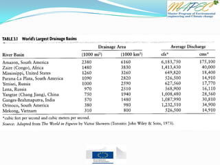 This document provides an overview of key concepts in surface water hydrology. It defines surface water hydrology and discusses watersheds, overland flow, rivers, lakes, sediment transport, water measurement, flood events, and the use of GIS mapping. Key terms are defined such as runoff, infiltration, river morphology, lake zones, discharge measurement, flood frequency, and probable maximum precipitation. Diagrams illustrate watersheds, hillslope flow, river cross-sections, lake layers, and more. Equations for rational formula and discharge calculation are also presented.