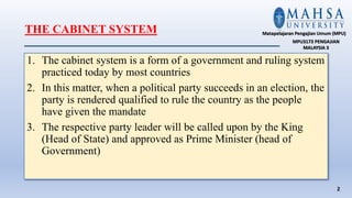 The document discusses Malaysia's administrative system and structure. It describes the cabinet system and the role of the Prime Minister as the head of government who works with various ministries. It provides examples of key ministries like Defense, Finance, and Trade and Industry. It also discusses statutory bodies that support the ministries and two commissions that help ensure smooth government operations.