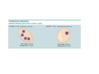 - Trophozoites: 10-30 μm, pear-shaped or rounded with broad blunt pseudopodia