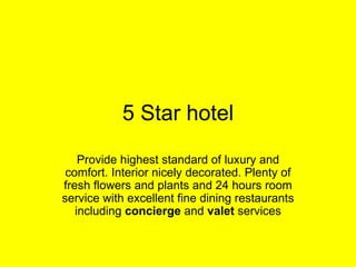 The document describes different types of hotels and accommodations, ranging from 5-star luxury hotels that offer high-end amenities and services to 1-star basic hotels with few amenities. Other accommodations mentioned include boutique hotels providing personalized service, budget hotels for low-cost lodging, hostels with dorm-style rooms, guesthouses offering rooms and breakfast, bed and breakfasts in private homes, motels for overnight driving stops, serviced apartments, and resorts providing recreation activities.