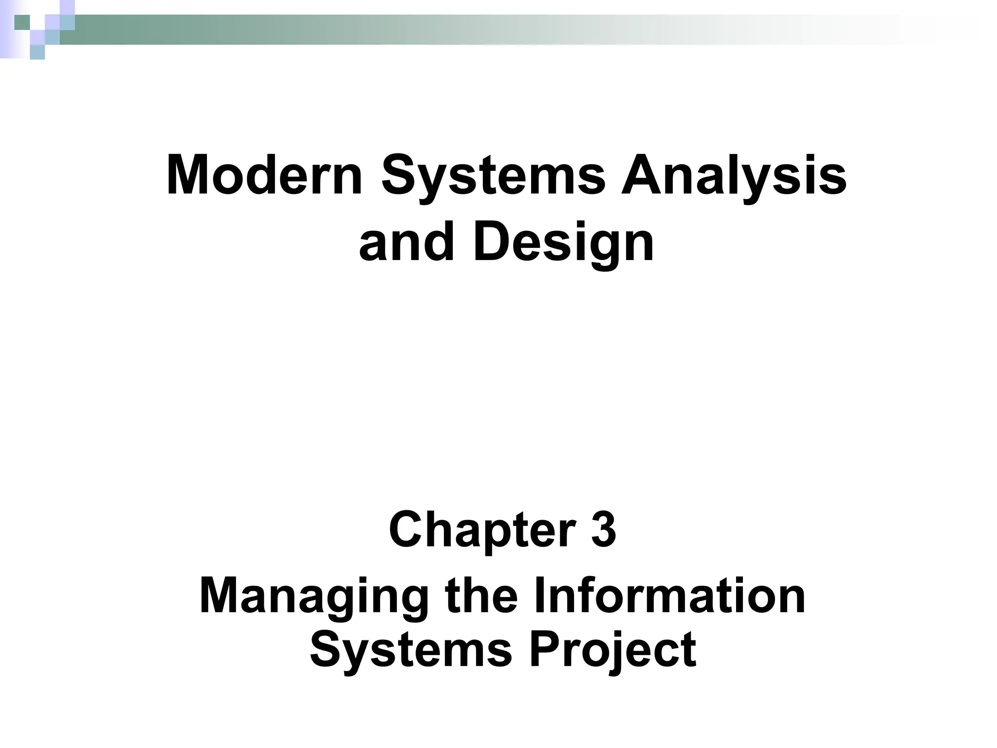 Chapter 3 covers the essentials of managing information systems projects, detailing the skills and processes involved in project initiation, planning, execution, and closedown. It emphasizes the importance of effective project management in meeting customer expectations and budget constraints, and introduces tools like Gantt charts and network diagrams for scheduling. Additionally, it discusses the use of commercial project management software to facilitate project organization and monitoring.
