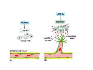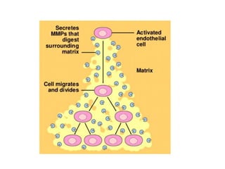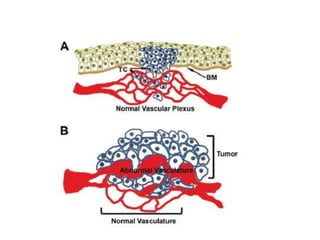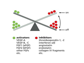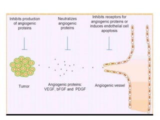 Tumor growth requires angiogenesis to develop new blood vessels. This process is regulated by a balance of pro-angiogenic and anti-angiogenic factors. Tumors disrupt this balance by inducing hypoxia and secreting factors like VEGF, which activate the "angiogenic switch" and promote new vessel growth. This allows tumors to recruit blood vessels to supply nutrients and remove waste. Anti-angiogenic therapies aim to block this process by targeting VEGF and its receptors. Drugs like bevacizumab and sorafenib inhibit angiogenesis to limit tumor growth and progression.