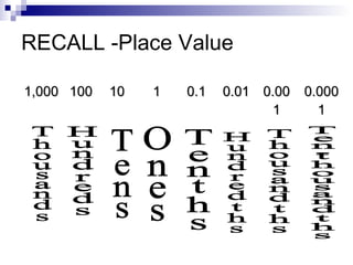This document discusses adding and subtracting decimals. It explains that when adding or subtracting decimals, the decimal points must be vertically aligned so that digits of the same place value are added or subtracted. Empty spaces can be filled in with zeros. Several examples of adding and subtracting decimals are provided and worked through step-by-step.