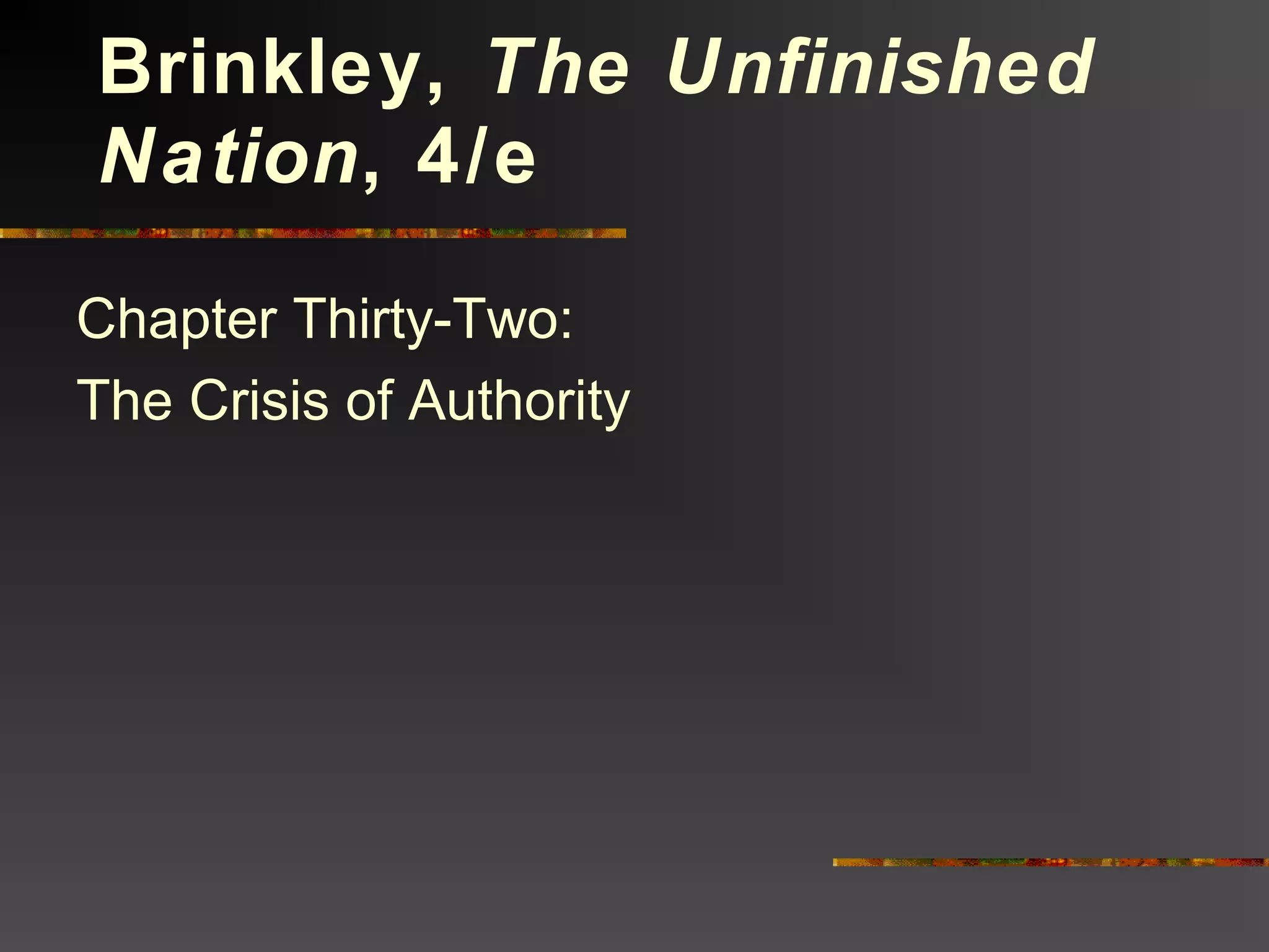 This chapter discusses the crisis of authority in the United States during the 1960s and 1970s. Key topics covered include the rise of the youth counterculture, the civil rights and anti-war movements, feminism, environmentalism, and the Watergate scandal that ultimately led to Richard Nixon's resignation from the presidency in 1974.