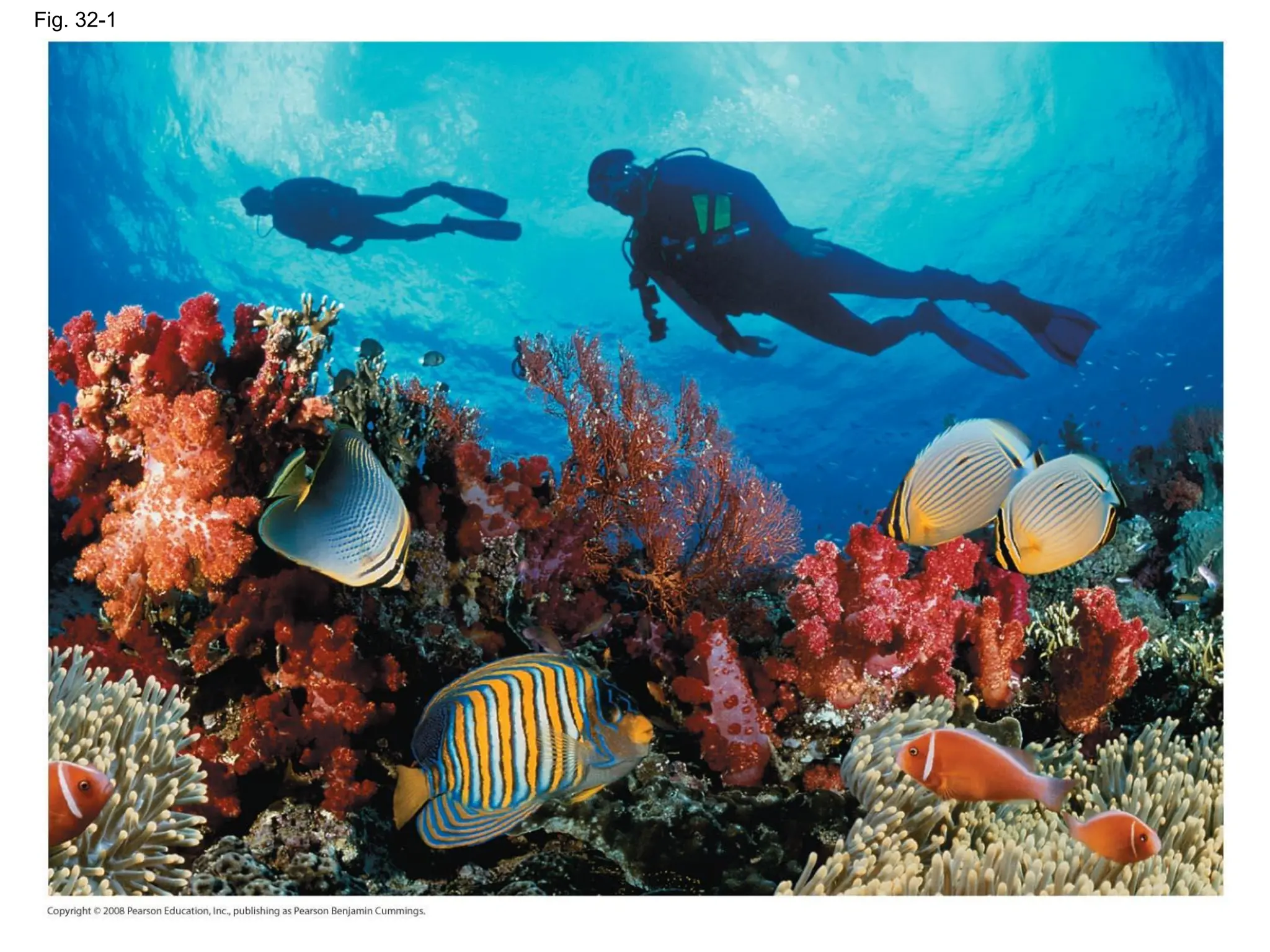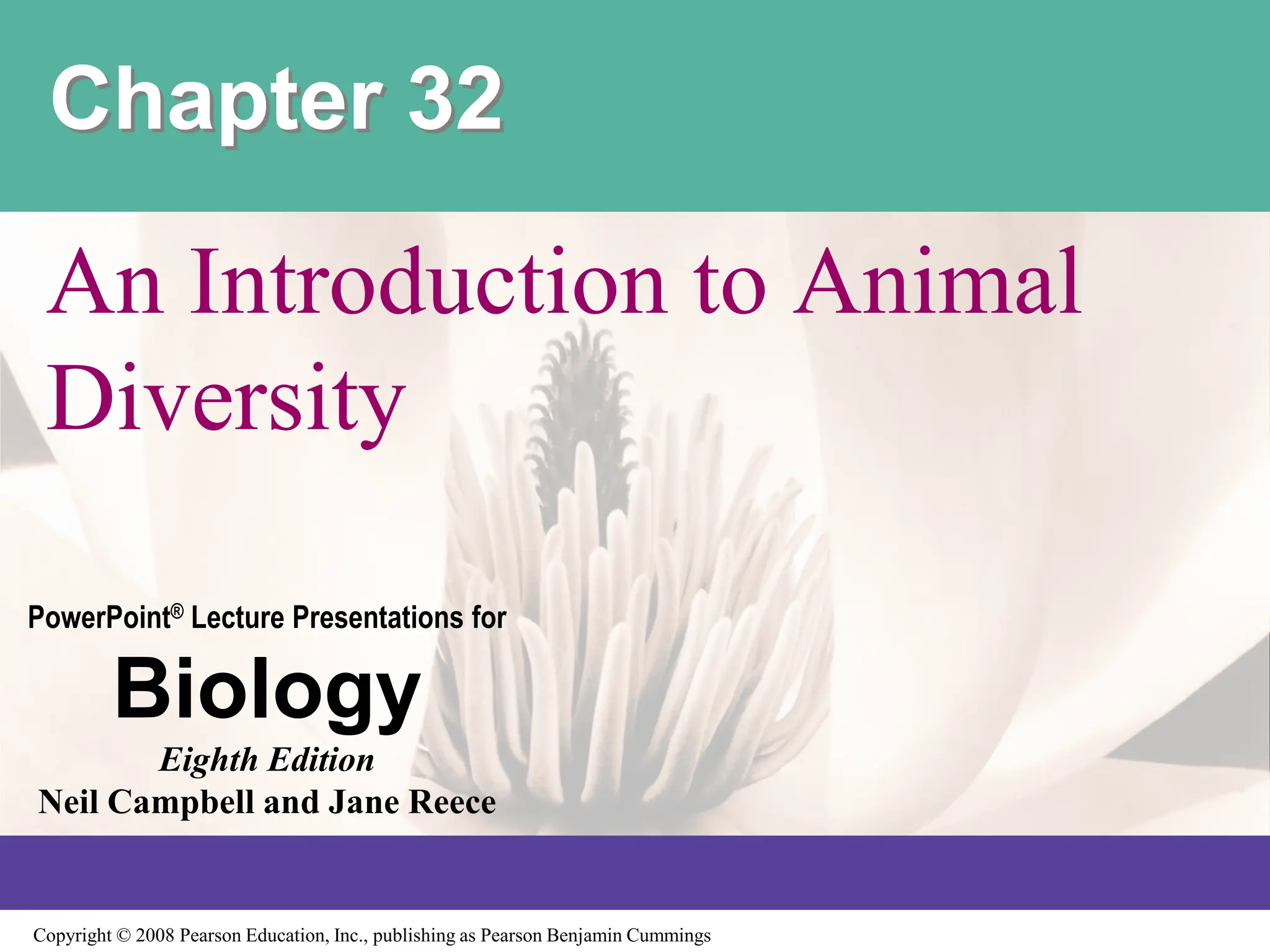 This document provides an overview of Chapter 32 from the textbook "Biology" by Neil Campbell and Jane Reece. It summarizes key concepts about the diversity of the animal kingdom, including that animals are multicellular, heterotrophic eukaryotes that develop from embryonic layers. It also discusses the evolutionary history of animals, major animal groups, and competing hypotheses for the phylogenetic relationships between animal phyla.