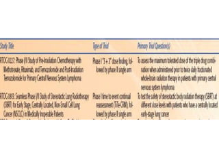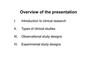 This document provides an overview of different types of clinical study designs, including observational studies and experimental studies. It discusses the key aspects and objectives of different phases of clinical trials, including: