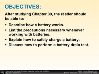 A battery works by a chemical reaction between lead plates and sulfuric acid electrolyte. During discharge, lead dioxide and lead plates react with sulfuric acid to form lead sulfate, and during charging, the reactions reverse. Key factors are the battery's cold cranking amps rating, which indicates its ability to start an engine in cold weather, and specific gravity of electrolyte, which indicates state of charge. Batteries have a limited lifespan due to shedding of active material from plates over time and risk of plates becoming sulfated.