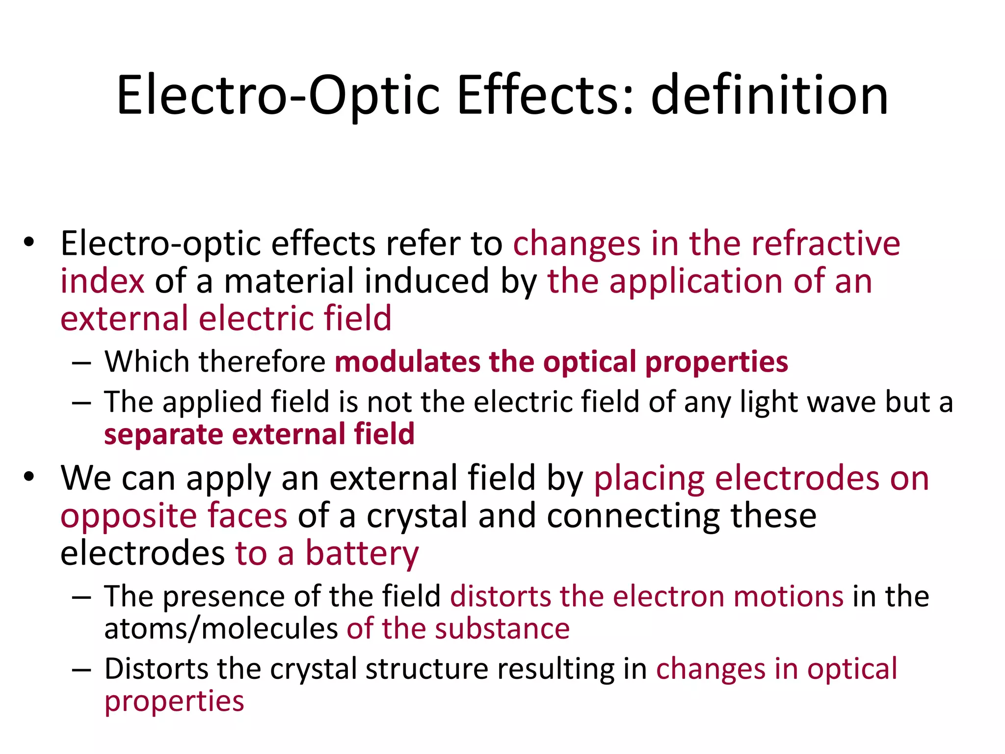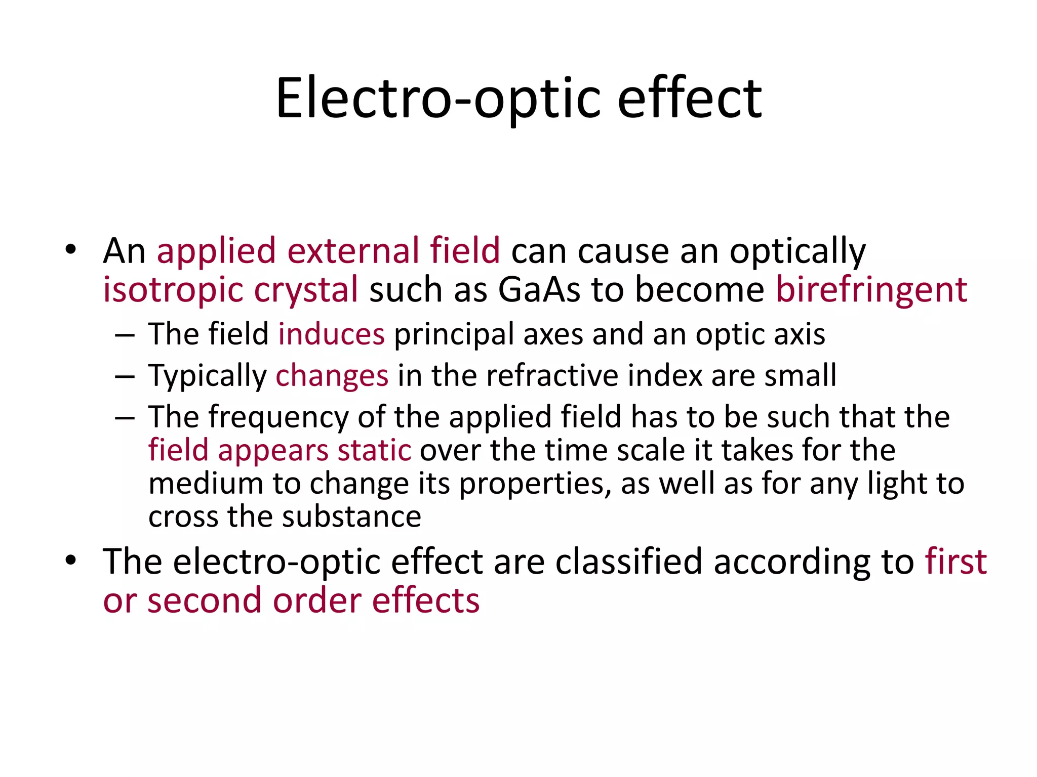 This document defines electro-optic effects and describes how an external electric field can induce changes in the refractive index of a material, modulating its optical properties. It discusses the Pockels effect specifically, where a linear change in refractive index occurs due to an applied electric field. This effect can be used to build integrated optical modulators and switches, such as a transverse Pockels cell that inserts a phase difference between orthogonal field components, acting as a polarization modulator. The phase difference can be converted to an intensity variation using an interferometer such as a Mach-Zehnder configuration.
