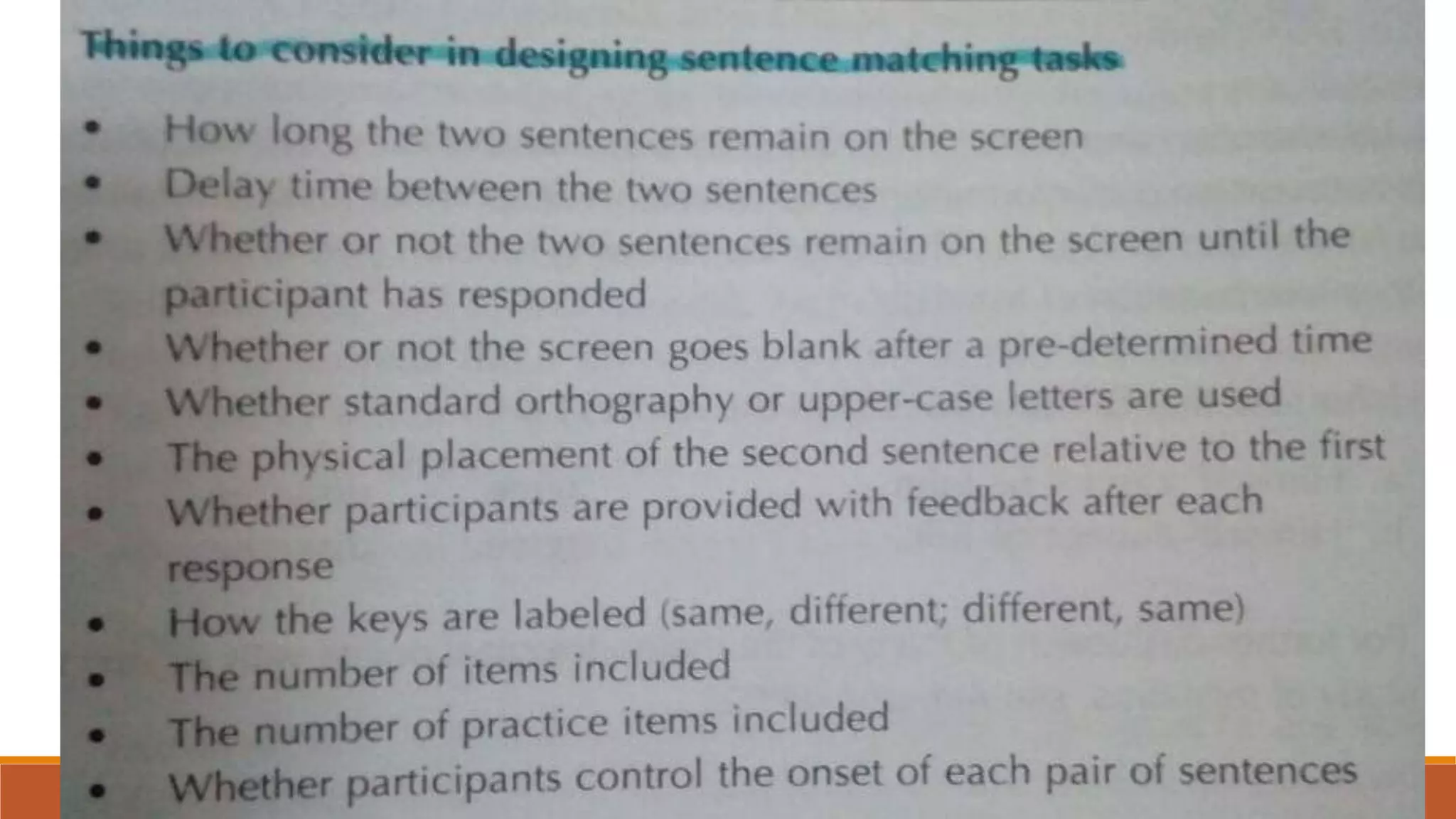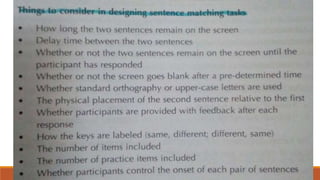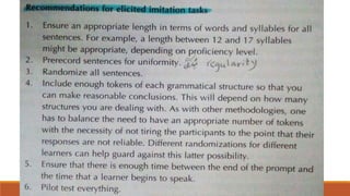 This document summarizes different methods for collecting data in second language research. It discusses pilot testing to refine materials and methods. It then describes various data collection measures like acceptability judgments, elicited imitation, magnitude estimation, and sentence interpretation tasks. It also covers processing research methods like reaction times, moving window techniques, and eye tracking. Finally, it discusses interaction-based research, strategy research, and sociolinguistic/pragmatics-based research methods.