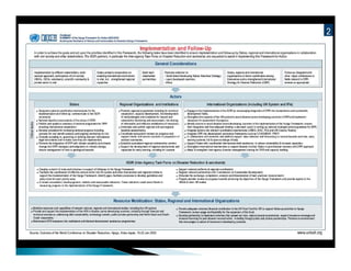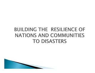 The document discusses the Hyogo Framework for Action (HFA), which is a 10-year plan adopted by UN Member States in 2005 to make nations and communities more resilient to disasters. It aimed to substantially reduce disaster losses by 2015 through cooperation across governments, agencies, and other partners. The HFA outlined five priorities for action and provided principles and strategies to achieve disaster resilience at local, national, regional and international levels.