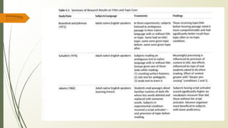 This document discusses the importance of context in language comprehension and learning. It presents research showing that providing contextual information and activating students' background knowledge can improve comprehension. Visual aids like pictures and videos are found to help lower-level learners, while techniques like discussing vocabulary, titles and questions are also effective, especially for more advanced learners. The role of schema theory is explained, which holds that comprehension involves both bottom-up processing of textual details and top-down processing using context and expectations. Contextualizing language instruction and practice is recommended over isolated teaching of forms.