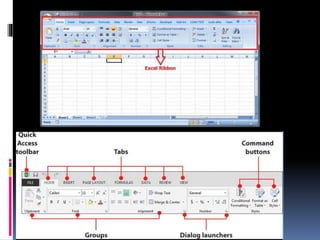 This document provides an introduction to Microsoft Excel 2007. It explains that Excel is a spreadsheet program that allows users to enter data, perform calculations using formulas and functions, and create charts. Key aspects of the Excel interface are described, including the ribbon interface with tabs like Home, Insert, and Page Layout. Functions like summing values in cells are demonstrated as examples of calculations. Advantages of Excel like ease of data entry, recalculation of formulas, and presentation of data in charts are highlighted.