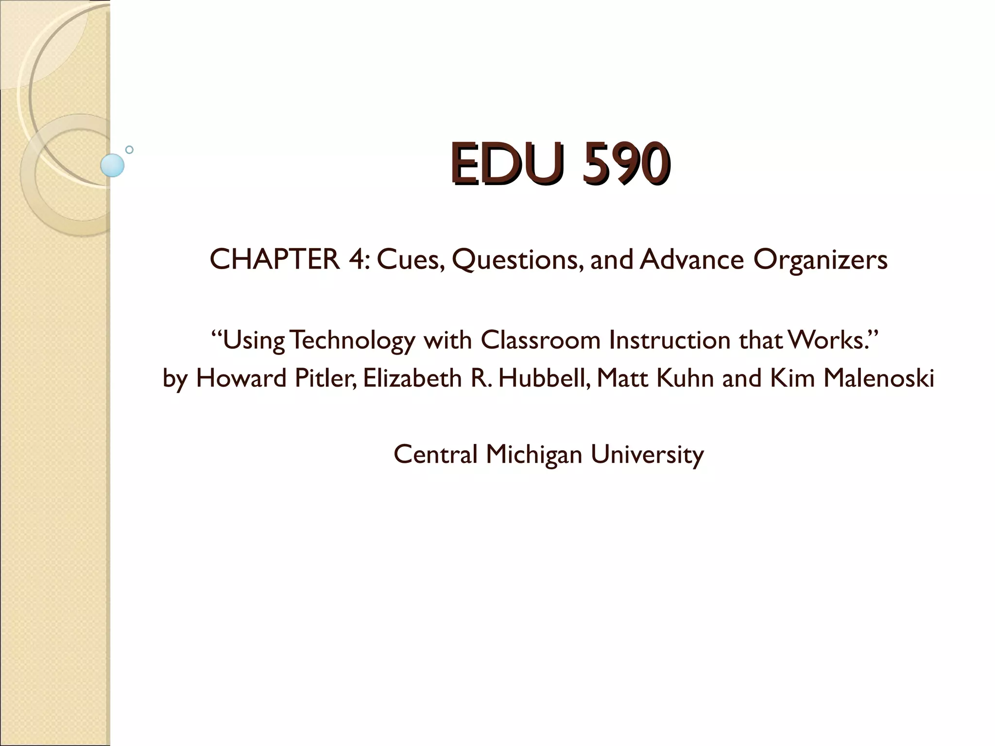 This chapter discusses cues, questions, and advance organizers as learning strategies. It recommends using different types of advance organizers like expository and narrative. Word processing and spreadsheet software can be used to create advance organizers. Organizing and brainstorming software allows creating graphic advance organizers with vocabulary terms and analytic questions. Multimedia is an extension of different advance organizers and allows for engaging previews and practice.