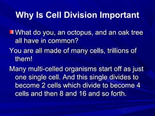 Cell division through mitosis and meiosis is essential for growth, development, and reproduction in organisms. Mitosis produces two identical daughter cells during normal growth and tissue repair. Meiosis produces gametes like sperm and egg cells that have half the number of chromosomes, allowing sexual reproduction to create offspring with a full set of chromosomes from both parents. DNA is replicated and passed on to new cells through these cell division processes to ensure genetic continuity.