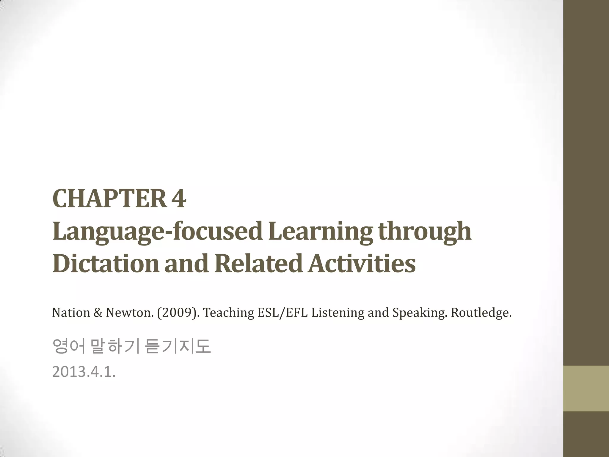 Dictation is a technique where learners listen to spoken language and write what they hear. It involves 100-150 word passages containing familiar vocabulary in new contexts. Variations include running dictation and dictogloss. Pre-dictation activities prime learners' listening by previewing words, questions, or repetitions. Dictation helps increase foreign language memory span through contextual practice listening and writing. Similar activities are dictogloss, oral reproduction, and retelling passages phrase-by-phrase.