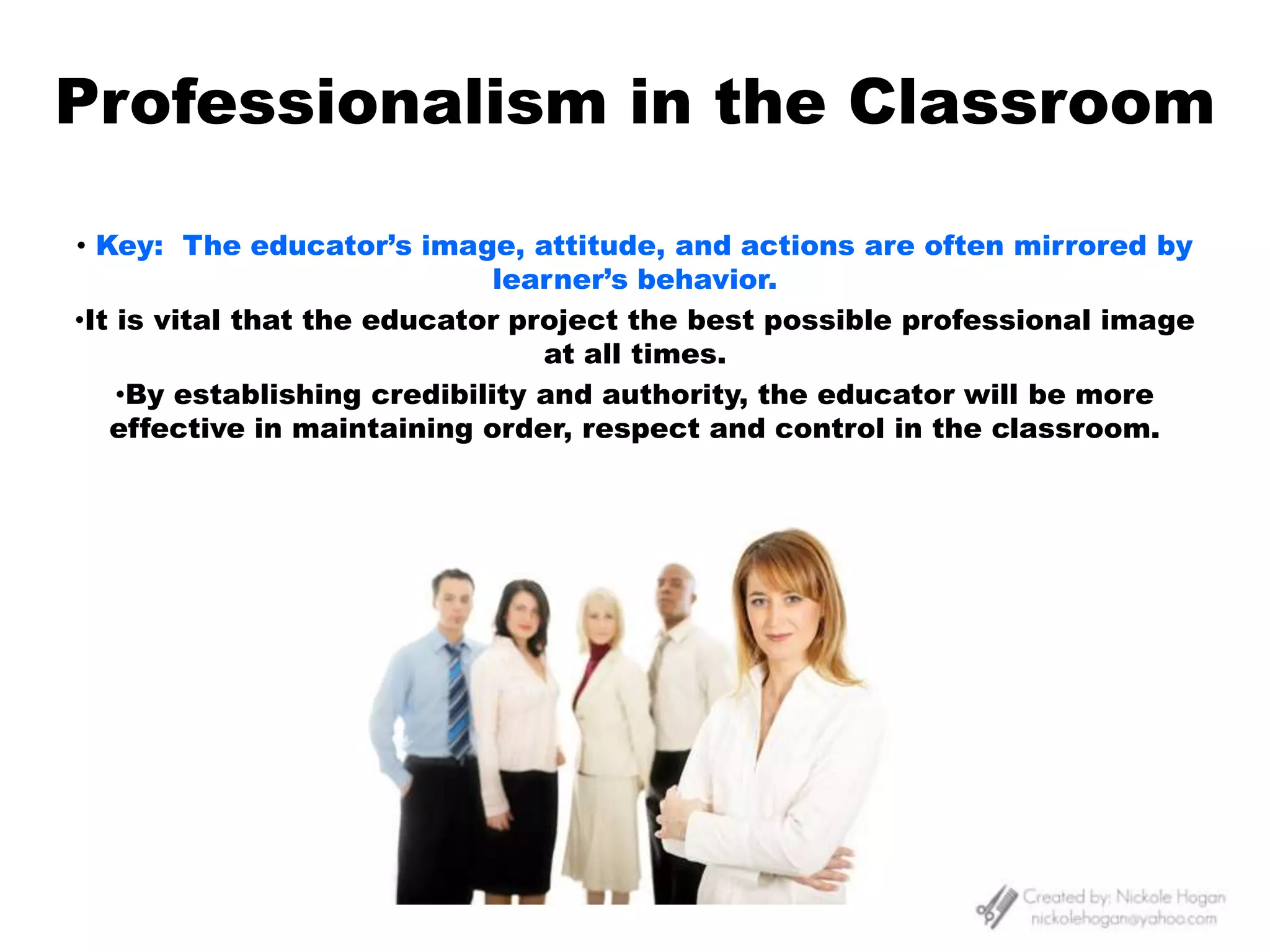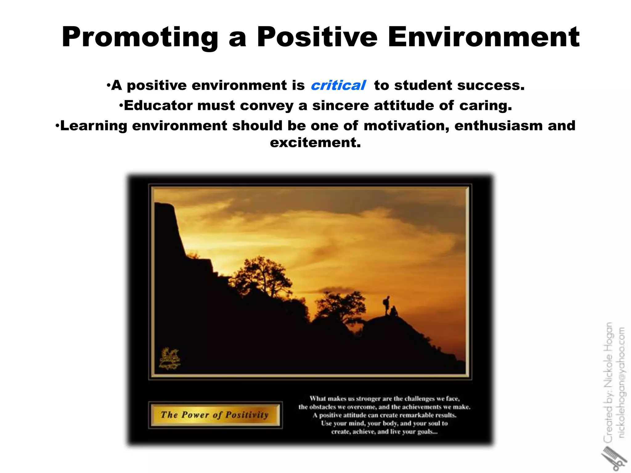 This document provides guidance for educators on promoting positive learning environments, managing learner behavior, addressing difficult situations, and providing academic advisement. It discusses establishing credibility and respect, setting clear expectations, focusing on positive reinforcement, addressing both minor and chronic misconduct, dealing with barriers to learning like shyness or distraction, and having strategies for common issues like tardiness, side conversations, or overparticipation. The key principles are maintaining professionalism, consistency, effective communication, and addressing issues without ridicule through tailored interventions for different learner needs and behaviors.