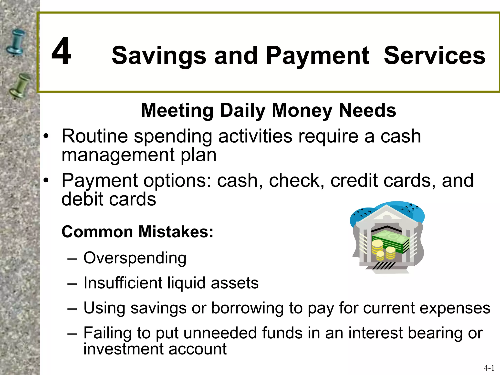 This document discusses various savings and payment services. It provides information on: