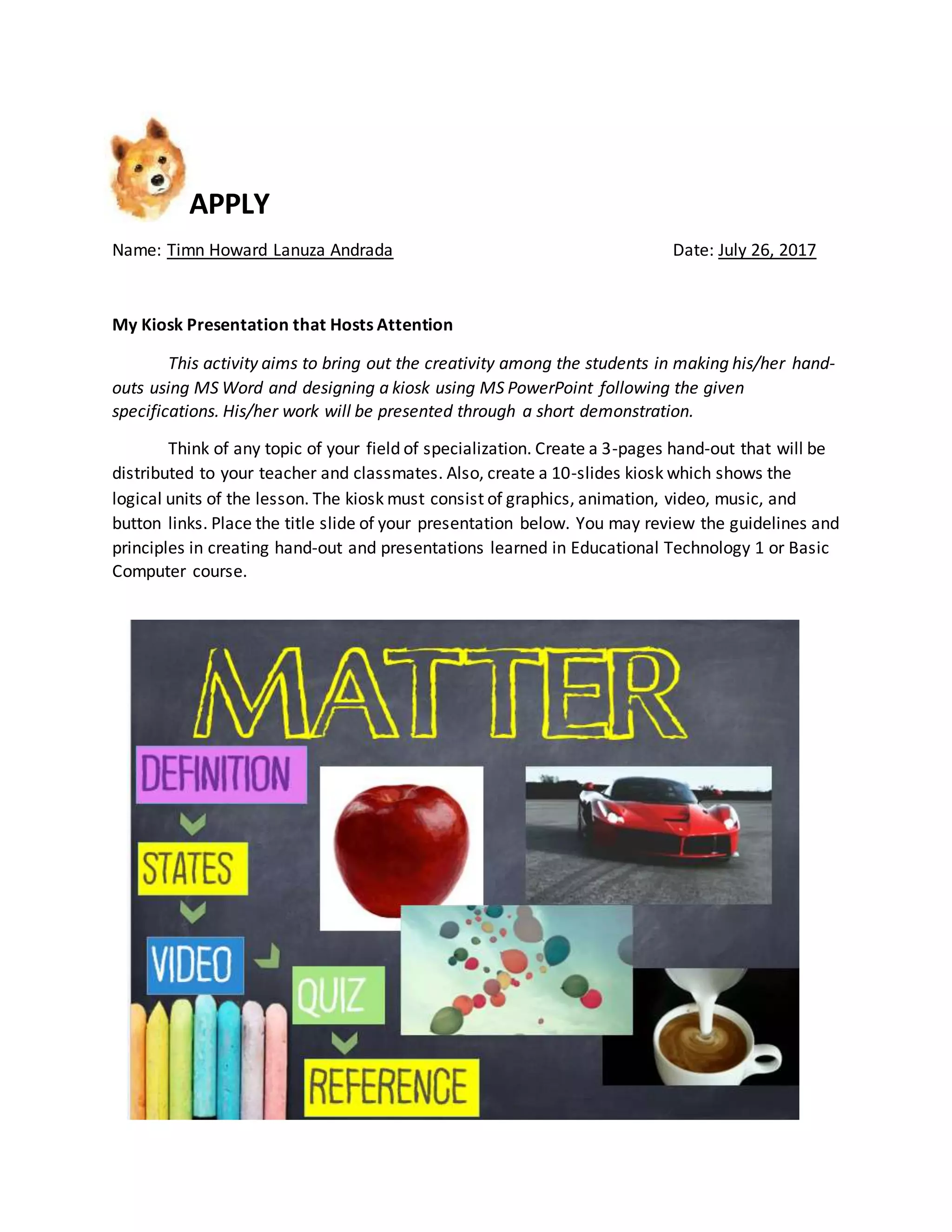 This activity aims to have students create their own evaluation tool to assess an educational kiosk presentation. Students work in pairs to design a rubric that evaluates the content, use of multimedia, presentation, delivery, message, and effectiveness of the kiosk. The rubric uses a scale of 1 to 4 to score different criteria such as information requirements, design elements, and presentation skills. Students are then asked to explain why it is important for teachers to evaluate educational technology for use in class and when checklists, rating scales, and rubrics should be used.