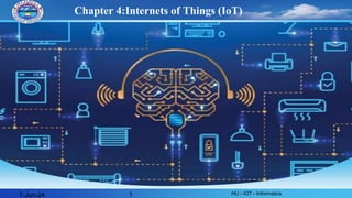 The document provides an overview of the Internet of Things (IoT), defining it as the network of smart objects intercommunicating through the internet to collect and exchange data. It discusses the advantages and disadvantages of IoT, including improved customer engagement but also security challenges, and outlines its applications across various sectors such as smart cities, healthcare, and agriculture. Additionally, the document introduces augmented reality (AR), describing its integration with the real world and its applications in education and medicine.