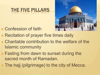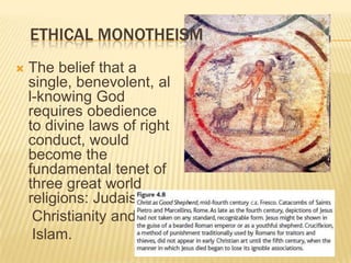 The document provides an overview of several major world religions: Judaism, Christianity, Islam, Hinduism, and Buddhism. It discusses their origins and key figures like Abraham, Moses, Jesus, Muhammad, Siddhartha Gautama. The major teachings and texts of each religion are summarized such as the Torah, Bible, Quran, Vedas, and Four Noble Truths. Symbols and houses of worship like the Star of David, mosques, and temples are also briefly described.