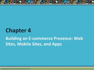The document discusses building an e-commerce presence through websites, mobile sites, and apps. It provides guidance on imagining an e-commerce strategy, including vision, target audience, and budget. It also covers website development processes like systems analysis, design, testing, and maintenance. Options for building and hosting a site include outsourcing or doing it in-house. The document discusses hardware, software, and tools needed for e-commerce sites and mobile presences.