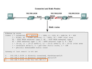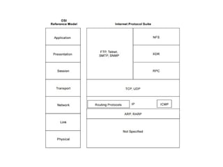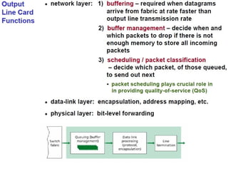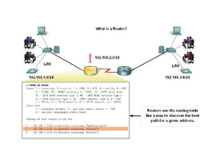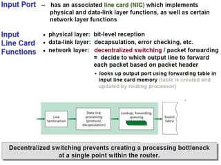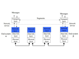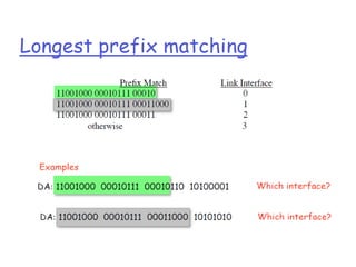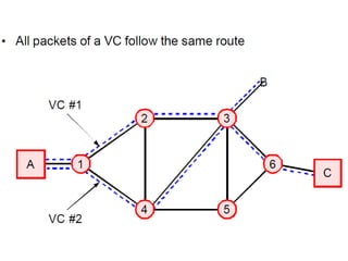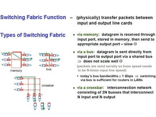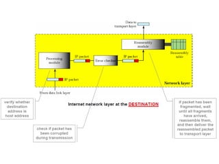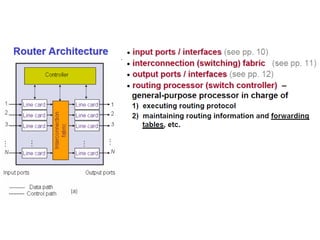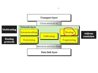 Chapter 4 of the document discusses the network layer of the OSI model, which facilitates end-to-end logical addressing for data routing across various networks. It outlines the functions of the network layer, including logical addressing, routing, and packet encapsulation, while describing switching techniques such as circuit, message, and packet switching. Additionally, the chapter explains routing algorithms, router functions, and the different types and metrics used in routing protocols.