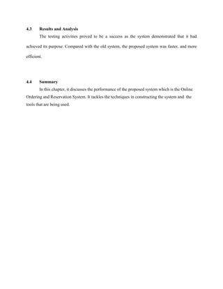 The document summarizes the performance analysis of an online ordering and reservation system. It discusses using two computers for designing and programming versus documentation. Adobe Photoshop, CSS, Dreamweaver, JQuery, and MySQL were used to design the system and create the database. PHP was chosen as the programming language since it is object-oriented and well-suited for website development. Testing proved successful as the new system was faster and more efficient than the old system.