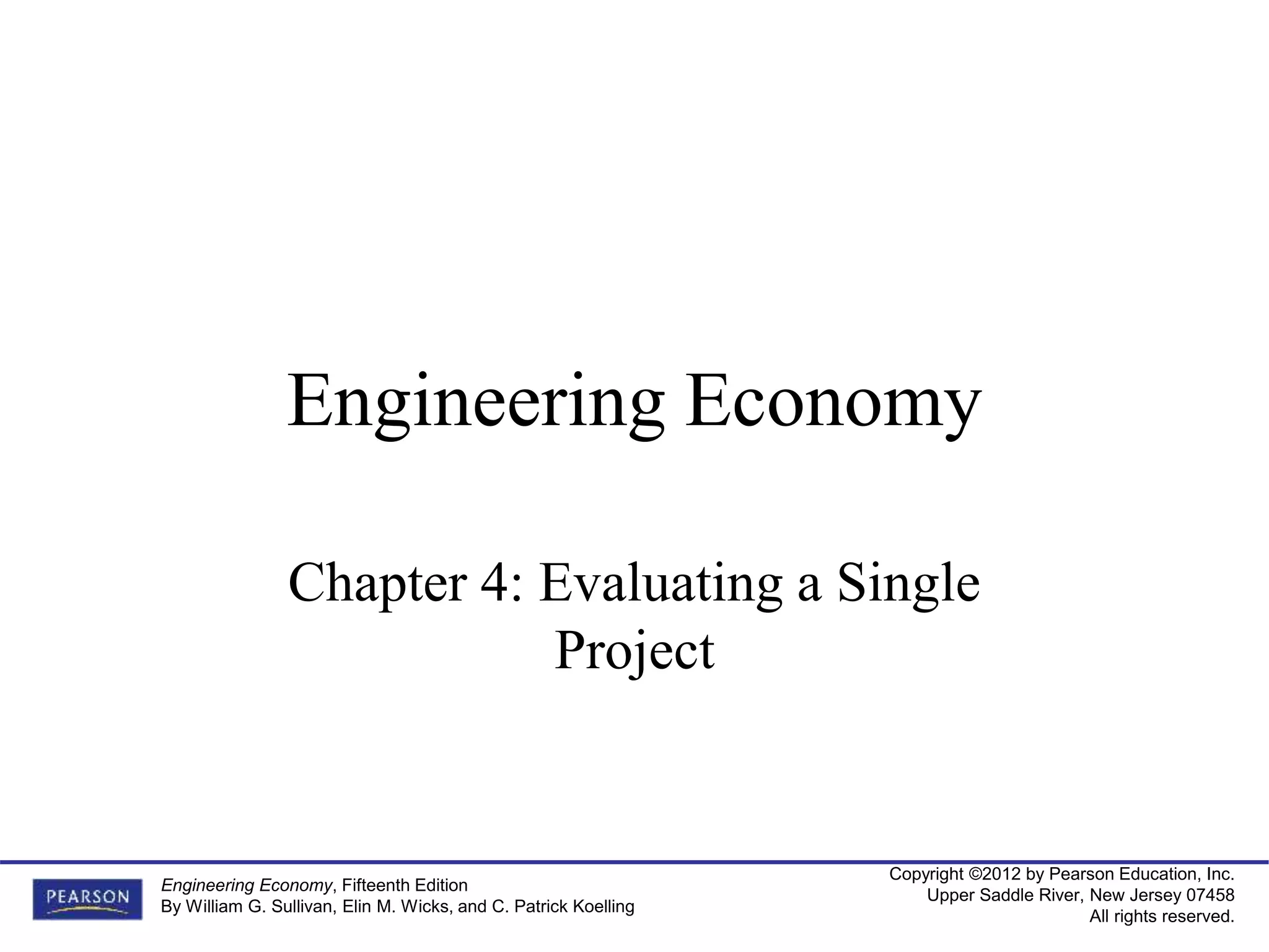 This document contains excerpts from Chapter 4 of the 15th edition of the textbook "Engineering Economy" by William G. Sullivan, Elin M. Wicks, and C. Patrick Koelling. Chapter 4 discusses methods for evaluating the profitability of single capital projects, including the present worth, future worth, and rate of return methods. It provides examples of how to use the present worth method to determine if projects are economically acceptable based on their net present worth. It also discusses the minimum attractive rate of return that projects are evaluated against.