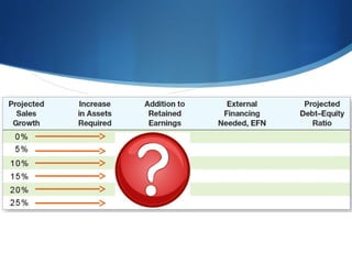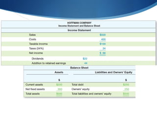 This document discusses pro forma financial statements and growth projections. It explains how to create pro forma income statements and balance sheets by varying accounts based on predicted sales growth, such as increasing dividends and retained earnings by 25% of the original amounts. It also discusses external financing options for growth, including debt and equity. The internal growth rate and sustainable growth rate formulas are provided to calculate the maximum growth a company can achieve without external financing based on its return on assets, retention ratio and return on equity. Determinants of a company's growth like profit margin, dividend policy, financial policy and asset turnover are also summarized.
