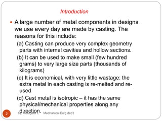 This document provides an overview of various casting processes and considerations for casting design and quality. It describes common casting methods like sand casting, shell mold casting, expendable pattern casting, investment casting, vacuum casting, die casting, and centrifugal casting. Key factors that affect casting quality are discussed, such as allowing for metal shrinkage during solidification, avoiding thin sections and corners prone to defects, and designing the parting line to be planar for easier mold separation. Overall, the document outlines fundamental concepts for casting processes and guidelines for optimizing casting design.