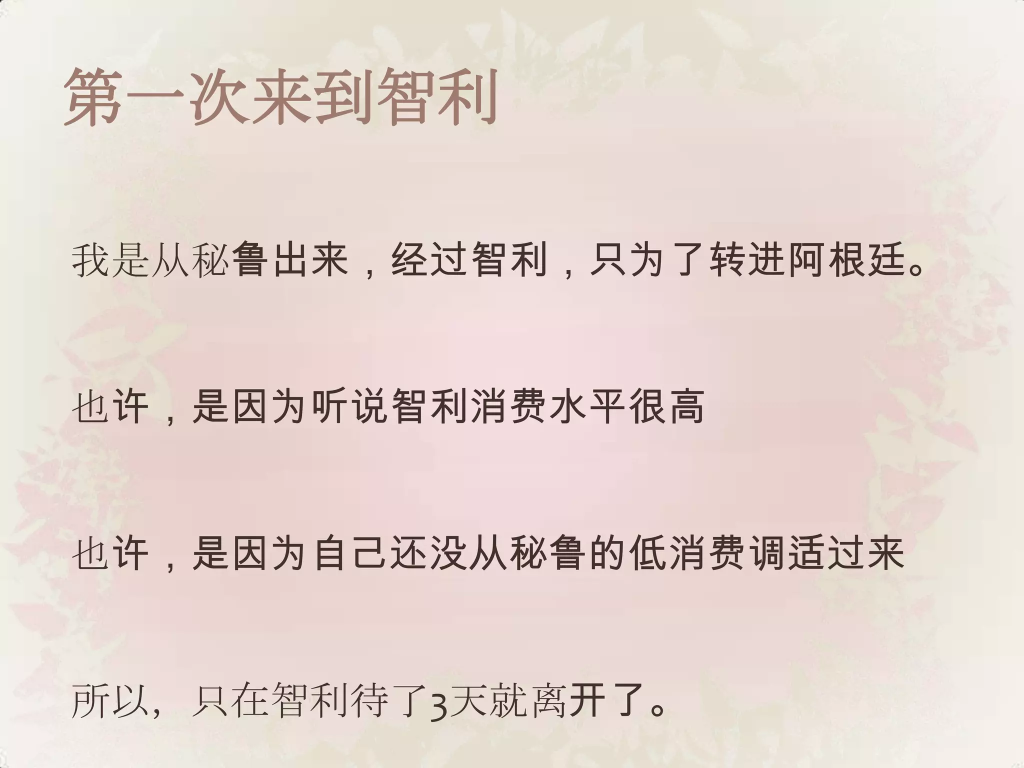 文档描述了作者第一次和第二次访问智利的经历,包括对智利消费水平、食物及民宿的观察。作者还提到智利的地理特征、文化遗产和社会状况,如足球文化和抗议运动。此外,文档中提到了智利的美丽风景和旅游之处,如chiloe岛及其历史建筑。