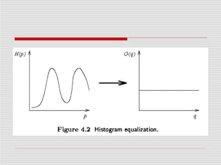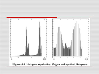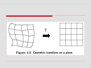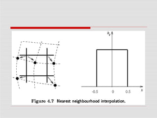 Image pre-processing aims to improve image quality by suppressing distortions or enhancing features. There are four categories of pre-processing methods based on pixel neighborhood size used: pixel brightness transformations, geometric transformations, local neighborhood methods, and global image restoration. Common pre-processing techniques include brightness corrections, gray scale transformations, geometric transforms to correct distortions, and interpolation methods like nearest neighbor, linear, and bicubic when resampling images. The overall goal of pre-processing is to enhance images for downstream analysis and processing.