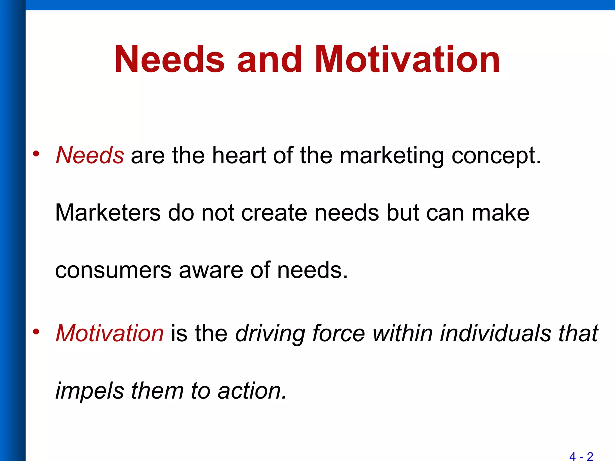 The document discusses consumer behavior, focusing on the concepts of needs and motivation as central to marketing. It categorizes needs into innate and acquired types, explains the motivation process, and explores the dynamics of goals, including rational and emotional motives. Additionally, it touches upon the impact of frustration and defense mechanisms, as well as the methodologies used in motivational research to understand consumer decisions.