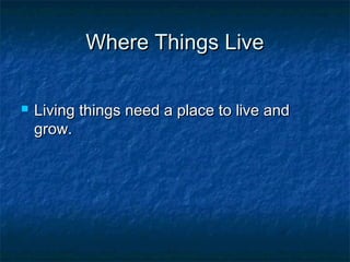 Ecosystems are made up of all the living and nonliving things in an environment. They consist of populations of organisms, communities of populations that interact, and habitats that meet organisms' needs. There are several main types of ecosystems including deserts, grasslands, oceans, rivers and lakes, and forests. Each ecosystem contains different plants and animals that are adapted to the environmental conditions.