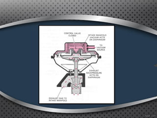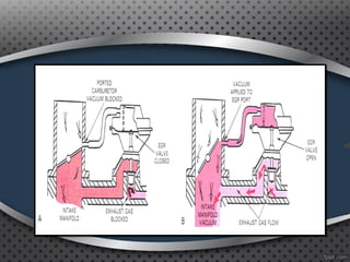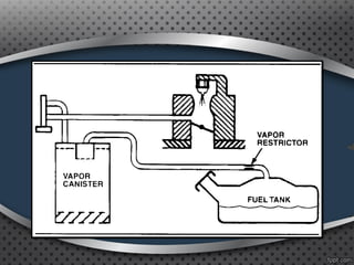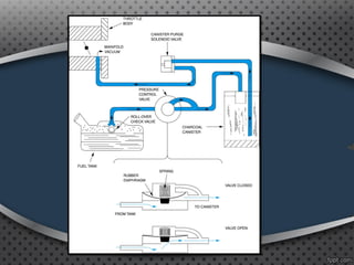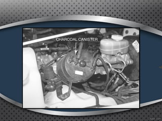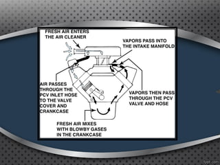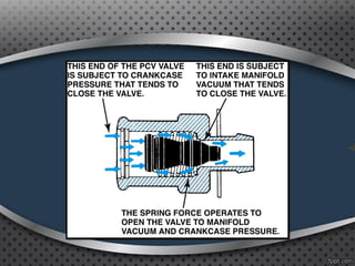 The document discusses positive crankcase ventilation systems which draw crankcase vapors into the engine's intake manifold to be burned. It describes how PCV valves control the flow of crankcase gases and air into the engine.
