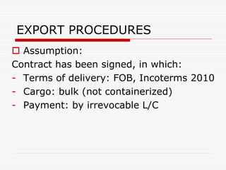 The document outlines the export and import procedures in Vietnam. For exports, it describes applying for an export license, preparing goods for shipment, arranging carriage and insurance, customs clearance, delivery to the port, and payment via letter of credit. For imports, it discusses applying for import licenses, opening a letter of credit, arranging carriage and insurance, customs clearance, taking delivery of goods, inspecting goods, and resolving disputes.