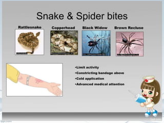This document provides comprehensive guidelines on first aid, defining it as emergency care given before professional medical treatment. It includes essential information on handling various medical emergencies, the contents of a first aid kit, and specific treatments for conditions like choking, burns, bites, and fractures. The document emphasizes the importance of personal safety for the first aider and the need for immediate professional assistance when necessary.