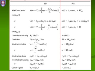 3) The modulation index determines the number of significant sidebands and bandwidth occupied. It is defined as the peak frequency deviation divided by the modulating signal frequency.