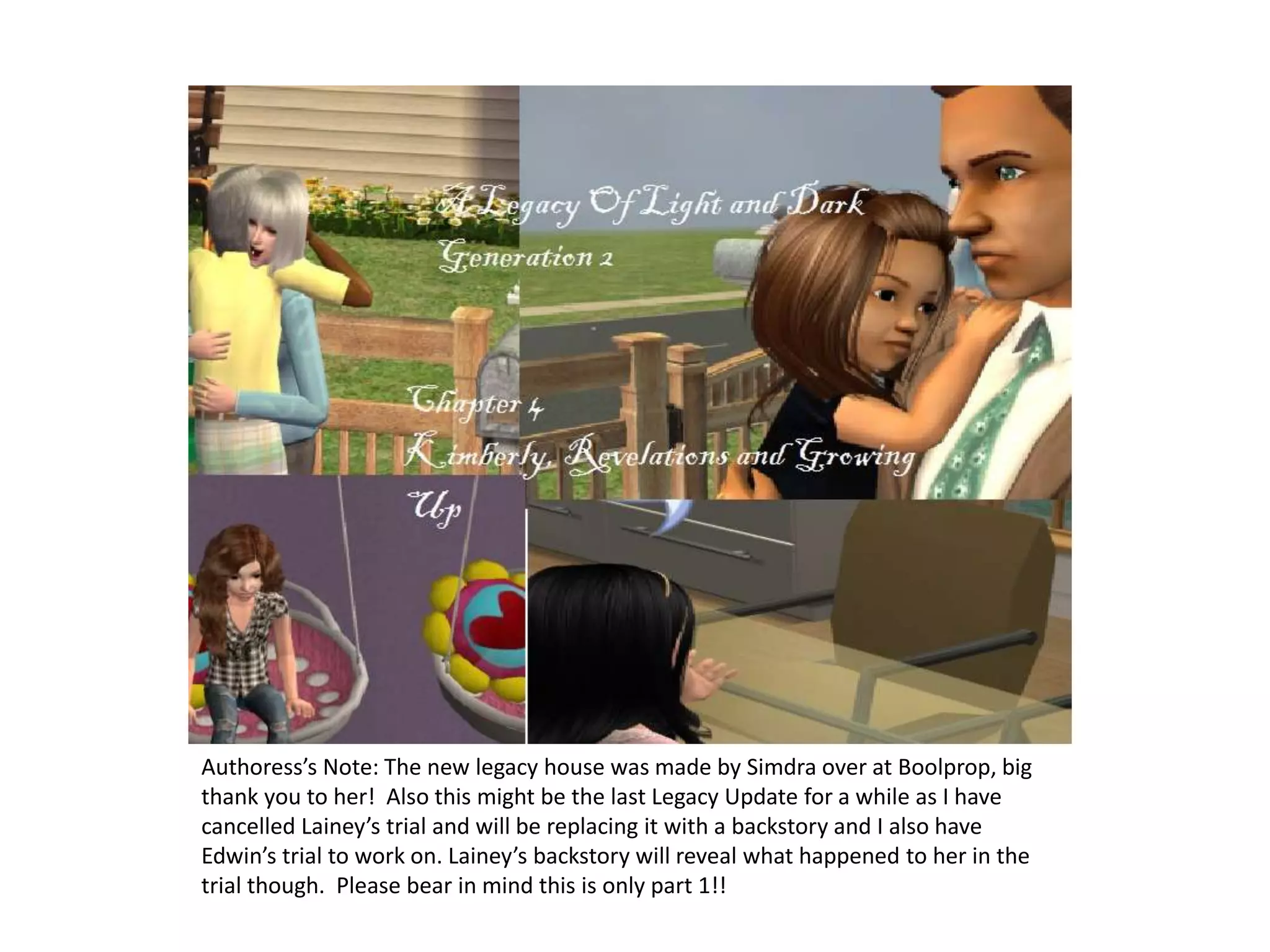 The document provides an update on the Legacy family. It discusses the new larger home built by Simdra at Boolprop. It then discusses the various children and grandchildren, including what some are studying in college. Gem wants to study fashion at Sim State like her cousin Kaitlyn. The document discusses Rosie and the twins, Rebecca and Keira. It notes Gem's mother wants her to study elsewhere. Madeline and Addie then discuss Edwin forcing Kimberly to write an essay about killing herself and their opinions on his actions.