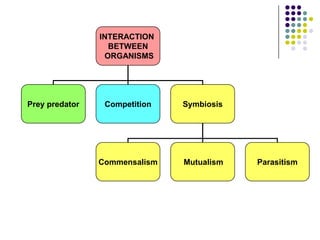 This document discusses different types of interactions between living organisms: prey-predator relationships, competition, and symbiotic relationships including commensalism, mutualism, and parasitism. It provides examples for each type of interaction: prey-predator examples include owls and rats; competition examples include competing for food or light; commensalism examples include remora fish and sharks; mutualism examples include lichen and nitrogen-fixing bacteria and plants; and parasitism examples include tapeworms and humans. The document also notes the effects of each interaction type on the organisms involved and discusses biological control as an alternative to pesticides in agriculture.